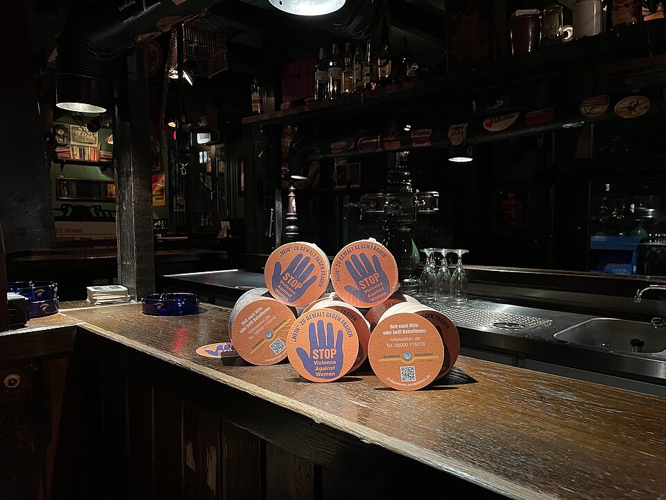 Bierdeckel serviert. Er ist orange mit einer blauen Hand in der Mitte. Am Rand des runden Stücks Pappe ist der der Aufruf „Stoppt Gewalt gegen Frauen“ aufgedruckt.